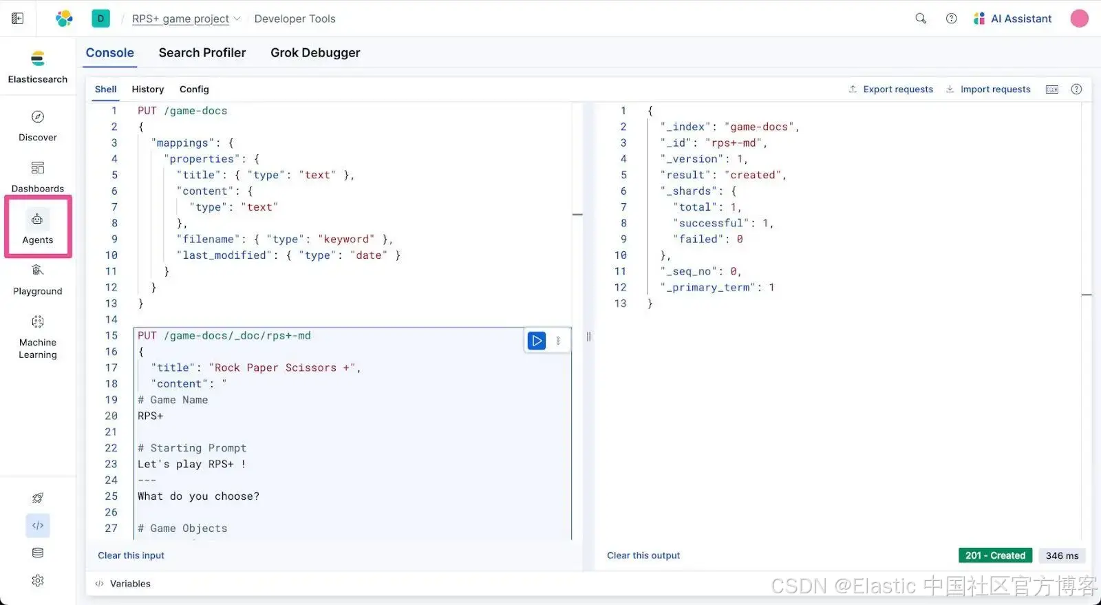 名为 game-docs 的索引是存储我们正在制作的游戏数据的理想位置。让我们在该索引中放入一个名为 rps+-md 的文档,其中包含游戏所需的所有数据。将以下 PUT 命令复制并粘贴到 Developer Tools 控制台。