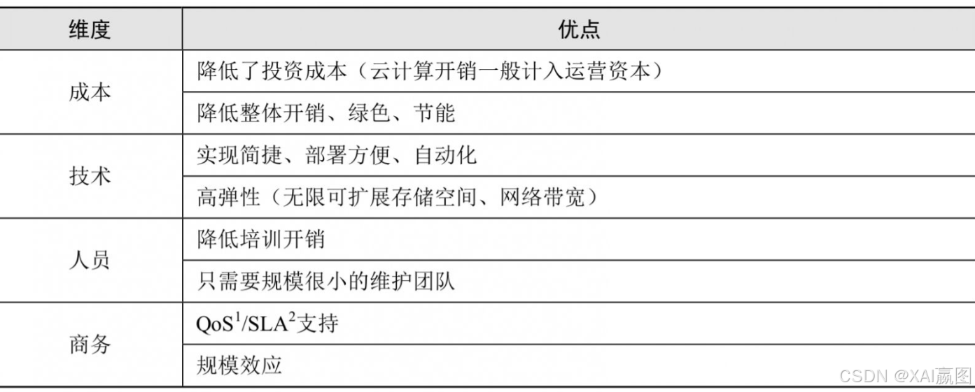 认知2:规模经济效益,即通过一定的经济规模形成的产业链在完整性、资源配置与再生效率上的提高所带来的企业边际效益的增加。我们身边常见的例子就是大型连锁超市和小超市的商品价格不同。一般来说,大型连锁超市的商品会比小超市商品的价格便宜,这是因为大型连锁超市的规模更大,供应链更完整。这也同样适用于云计算领域,当云计算的规模较小时,相对的亏损比例会很高,而盈利的能力难以体现。只有当规模越来越大时,才会逐渐降低亏损并最终实现正向盈利。我们看到的情况是,截至目前,市场上做得比较好的是AWS,其他厂家还在不断探索和继续扩大规模。我们用一张表来说明云计算的优点,见表1-2。