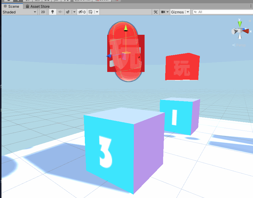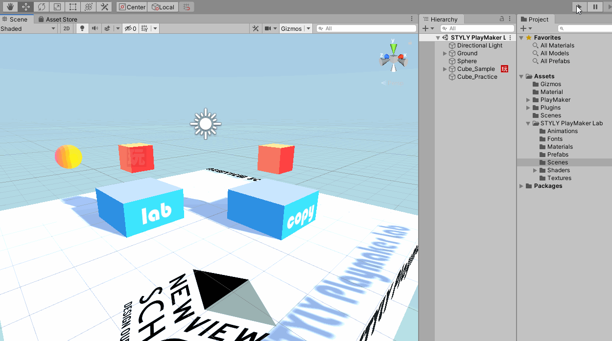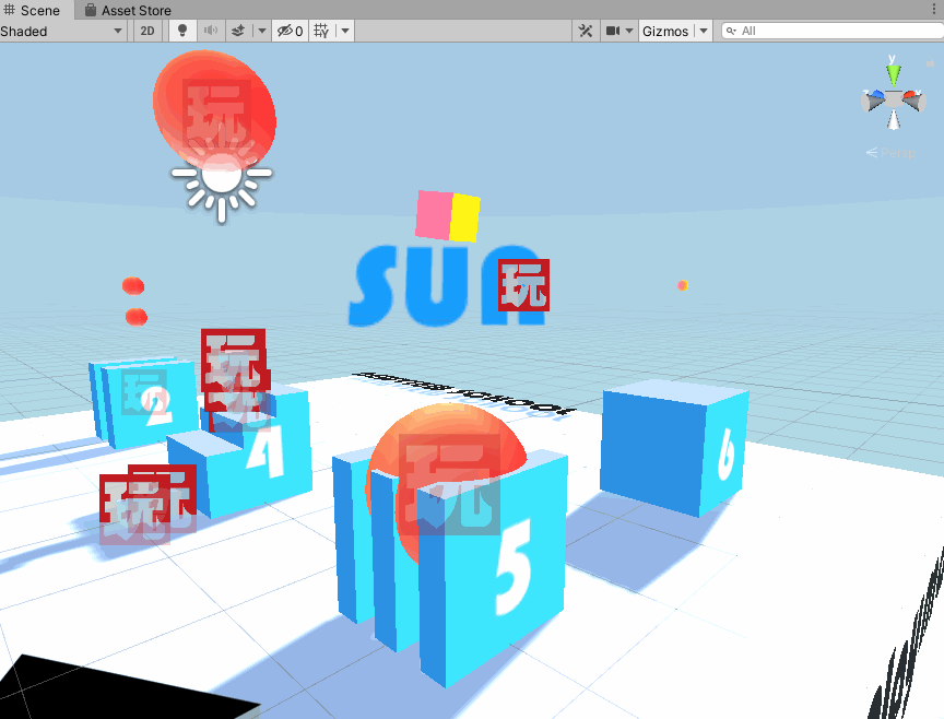 当 Cube 与 05_Sample 中的 Sphere 发生碰撞时,我们引入了一个 Action,将文本从 SKY 更改为 SEA 再到 SUN。