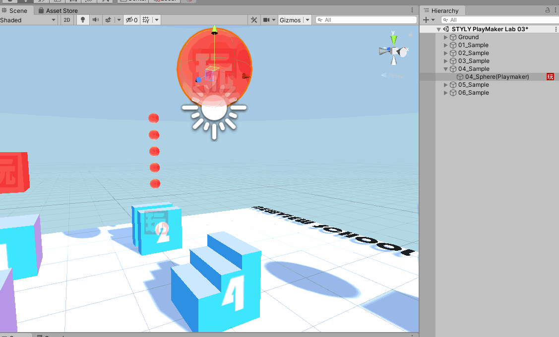 在层次结构中选择 04_Sample 的 (子对象) 04_Sphere (PlayMaker)。