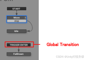 在下面的示例中,事件 “TRIGGER ENTER” 会导致过渡到 “FallDown”,无论它是 “Move” 还是 “Idle”。