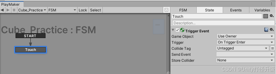 事件包括从 Unity 接收的事件(例如碰撞、触发器和鼠标输入)以及由活动状态的操作(例如距离检查、超时和游戏逻辑)触发的事件。