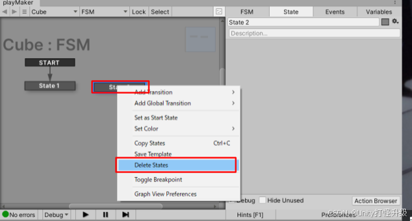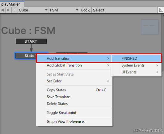 您可以通过右键单击 PlayMaker 编辑器并选择添加状态来添加新状态,也可以通过在 PlayMaker 编辑器上按 Ctrl + 左键单击 (Windows) / 命令 + 单击 (macOS) 来添加 PlayMakerFSM。