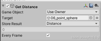 Store Result 是存储结果的变量;如果创建一个名为 Distance 的变量,并在其中输入 Game Object 和 Target 之间的距离值,则可以在其他操作中使用 Distance 的值。