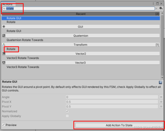例如,如果您想要向立方体添加一个“旋转”动作,在搜索表单中输入“旋转”,然后双击旋转或拖放旋转到一个状态,或者点击右下角的添加动作到状态。