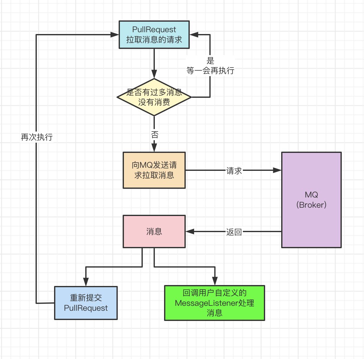 ②先去判断有没有过多消息没有消费,如果有的话,那么就间隔一定时间再次从①开始执行拉取消息的逻辑