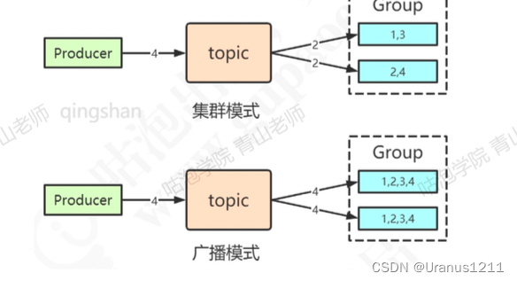 消费者有两种消费模式:集群消费(消息轮询),广播消费(全部收到相同副本)