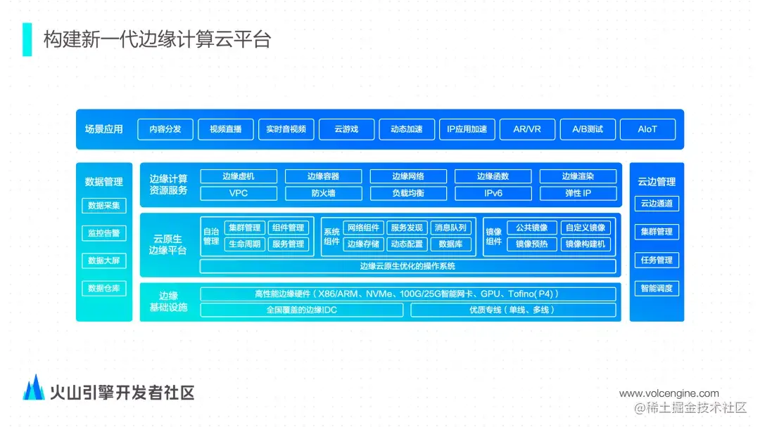 - 其次,在平台层,基于边缘基础设施底座,火山引擎边缘计算自研了云原生边缘平台,以面向边缘云原生的操作系统为核心,提供边缘自治管理、核心系统组件管理以及大规模部署的镜像服务能力。