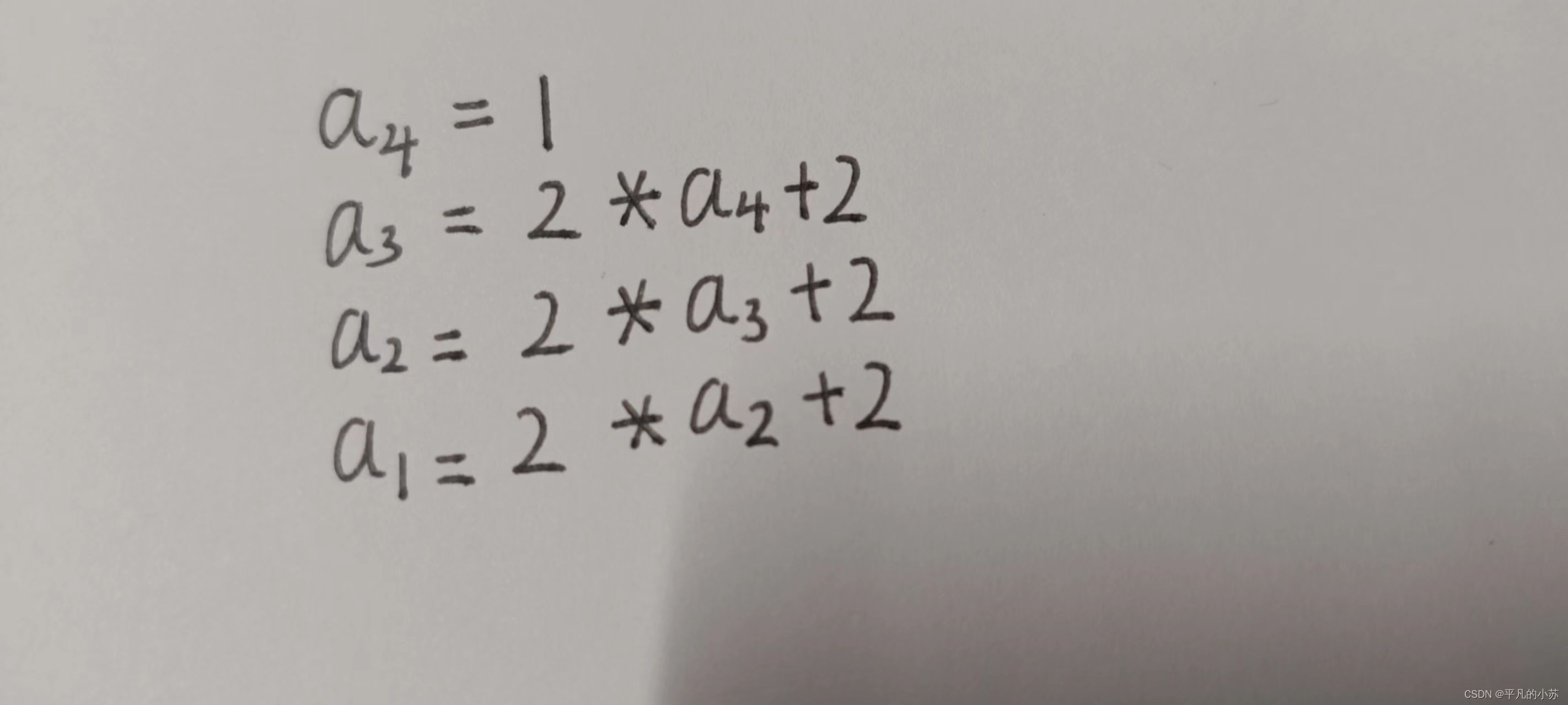 主要思想:依题意知,每次吃一半的桃子加一个,到最后一天会剩余一个桃子。那么我们把第十天来当成第一天,从小推大的方法就是,首先第十天剩余一个,那么第九天就是乘以两倍加一个桃子再加剩余没吃的桃子,得到第八天桃子数量,然后第八天乘以两倍加一个桃子,在加剩余一个没吃的得到第七天的桃子数量。以此类推得到第一天摘了多少个桃子。