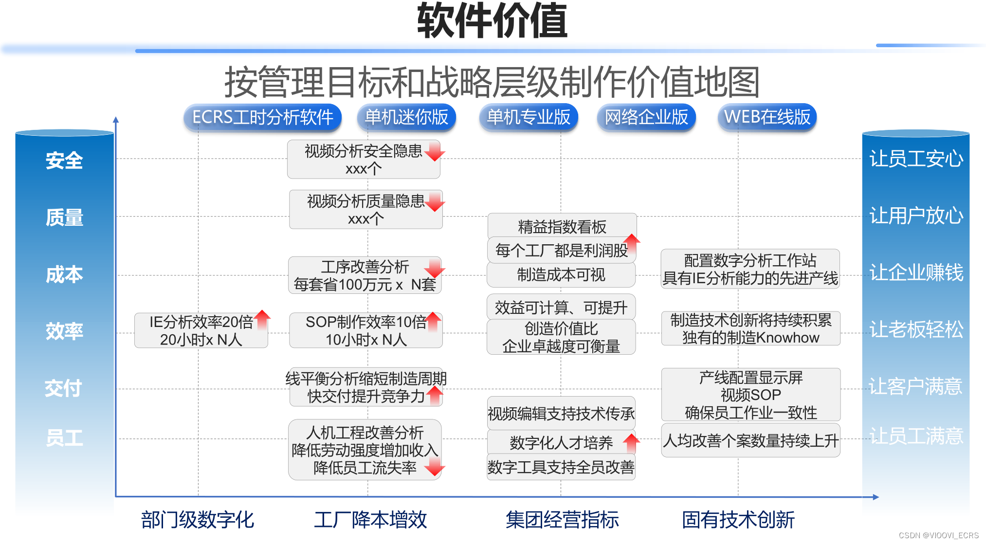 在实际操作中,我们发现这些步骤并不简单。因此,我们需要寻找更有效的工具来帮助我们完成任务。VIOOVI研发的ECRS工时分析软件正是为了解决这一问题而开发的。该软件结合了精益生产理念和生产线平衡分析方法,包括动作分析、线平衡分析、工时测量、效率分析等功能模块。通过高清视频观察每一个细微动作,并可实现按帧的毫秒计时。