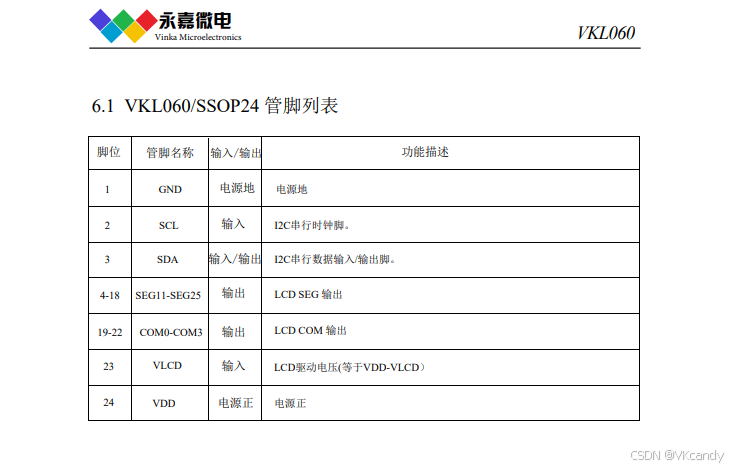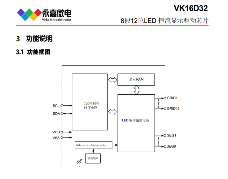 VK1629 3.0~5.5V 驱动点阵:128 共阴驱动:16段8位 共阳驱动:8段16位 通讯接口:CLK/STB/DIN/DOUT。VK1S38A 3.0~5.5V 驱动点阵:64 共阴驱动:8段8位 共阳驱动:8段8位 通讯接口:CLK/STB/DIO。VK16K33C 3.0~5.5V 驱动点阵:64 共阴驱动:8段8位;VK1640 3.0~5.5V 驱动点阵:128 共阴驱动:8段16位 共阳驱动:16段8位 通讯接口:CLK/DIN。