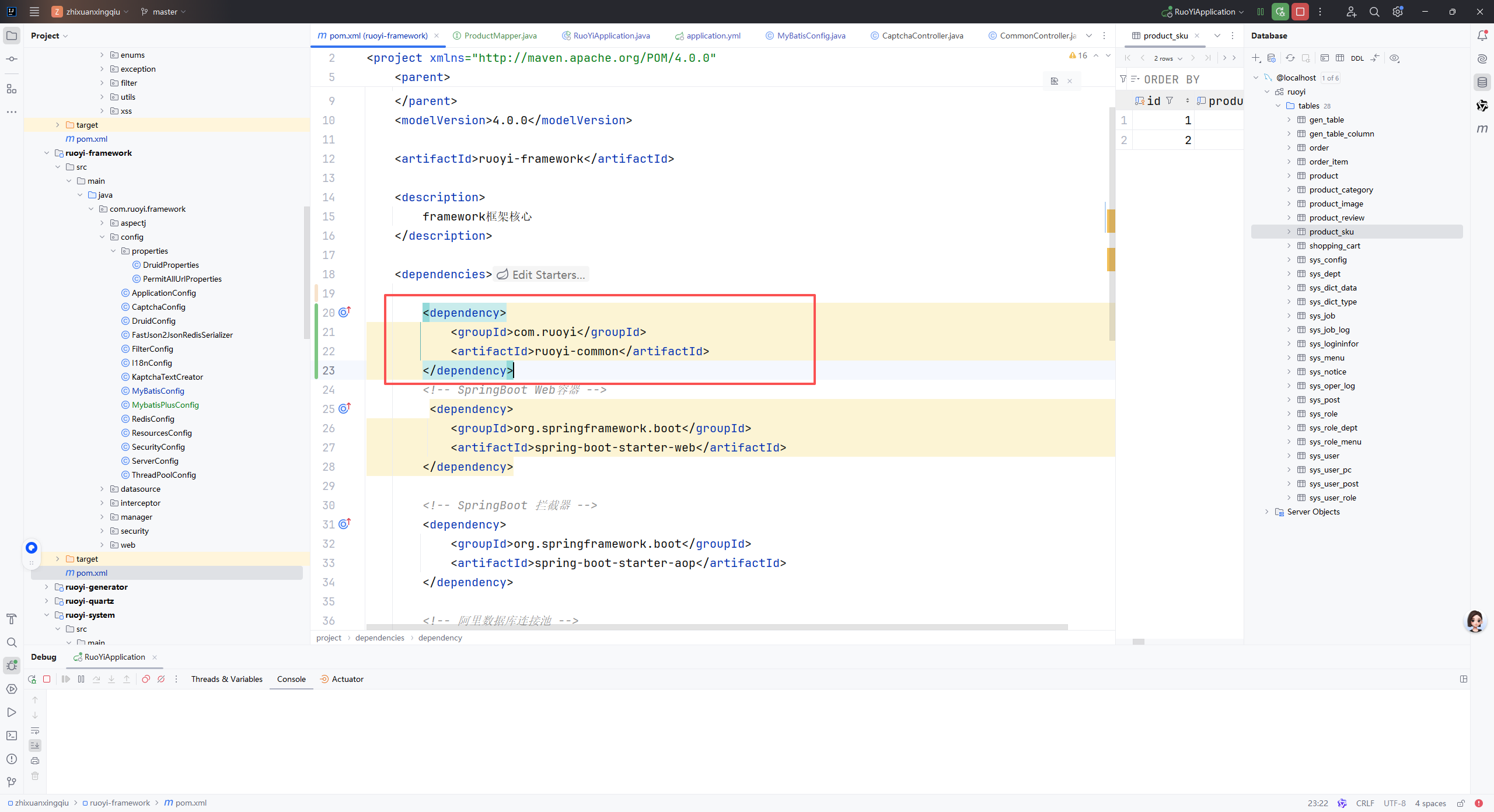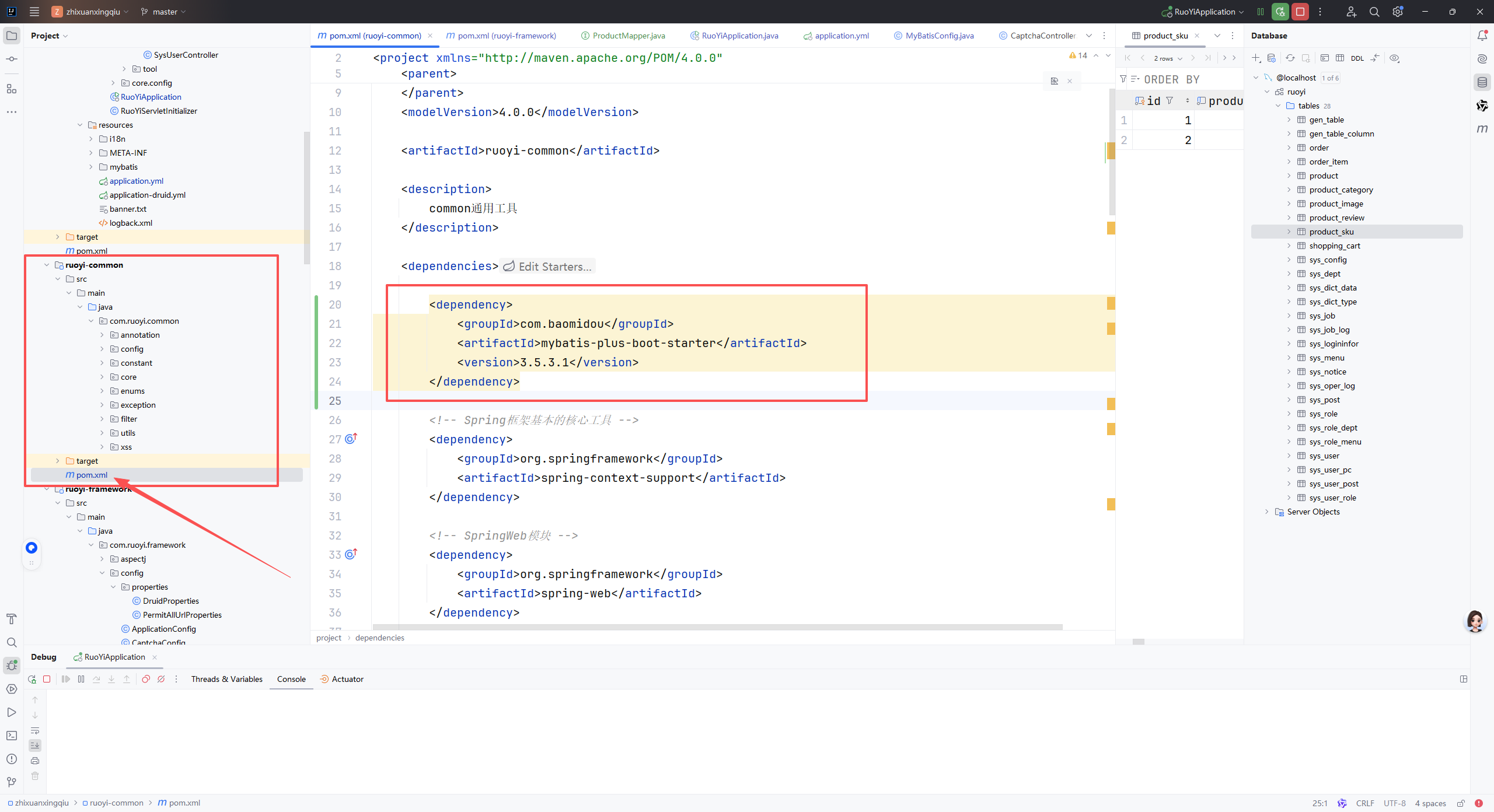 5、在ruoyi-framework模块下的pom.xml中引入ruoyi-common依赖