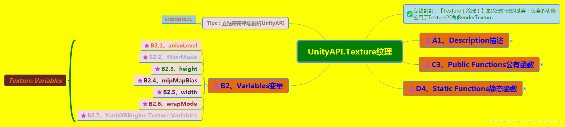 ++B2、Variables变量++++B2.1、anisoLevel++++B2.2、filterMode++++B2.3、height++++B2.4、mipMapBias++++B2.5、width++++B2.6、wrapMode++++B2.7、YanlzXREngine.Texture.Variables |