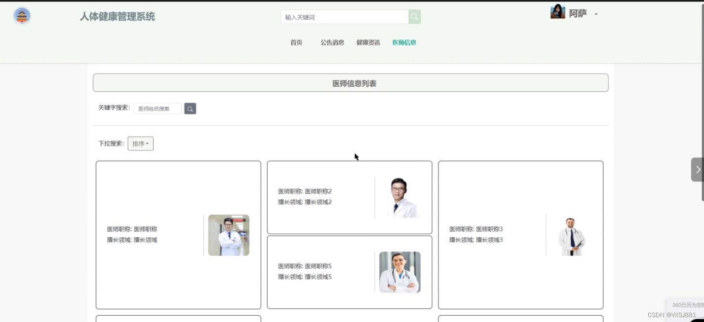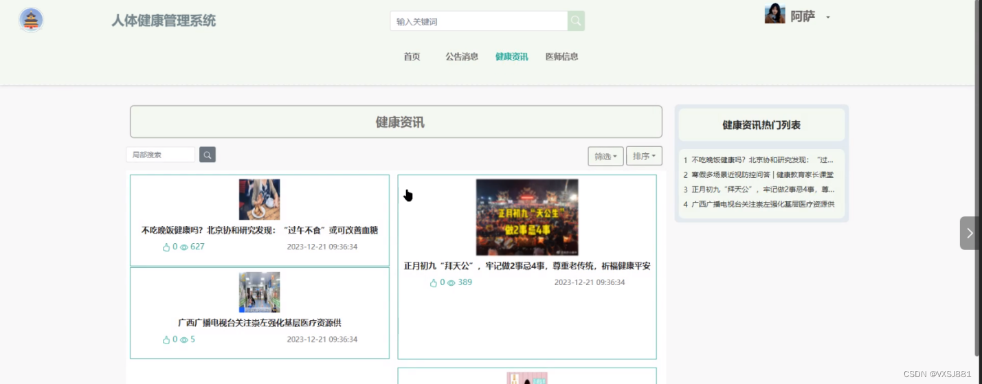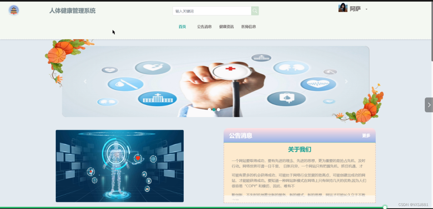- 首页:系统首页以上中下的布局进行展示,正上方是系统的导航栏,中间是轮播图,下面是公告消息、健康资讯等信息。