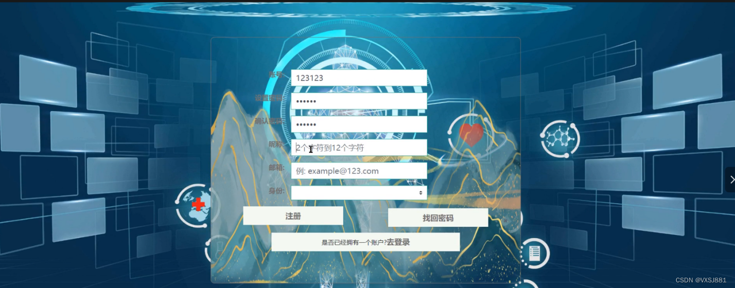 - 注册登录:用户点击首页右上角“注册”按钮进入注册页面填写账号、密码、确认密码、昵称、邮箱、身份等信息后点击“注册”按钮,注册后需由管理员进行审核,审核通过后方可使用账号密码登录。