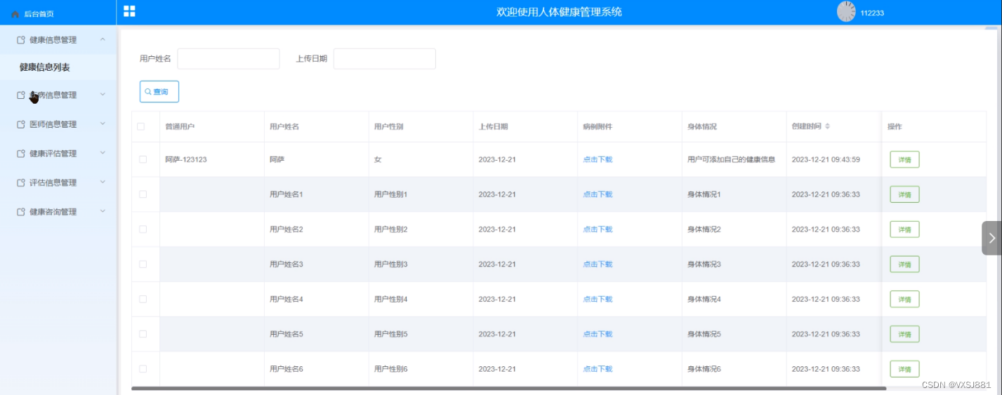 - 健康信息管理:用户可以查看健康信息列表中某一用户详情,可以下载查看用户病历。
