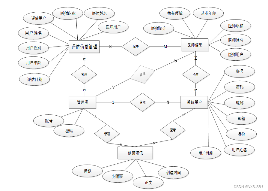 下面是整个Spring boot人体健康管理系统中主要的数据库表总E-R实体关系图。