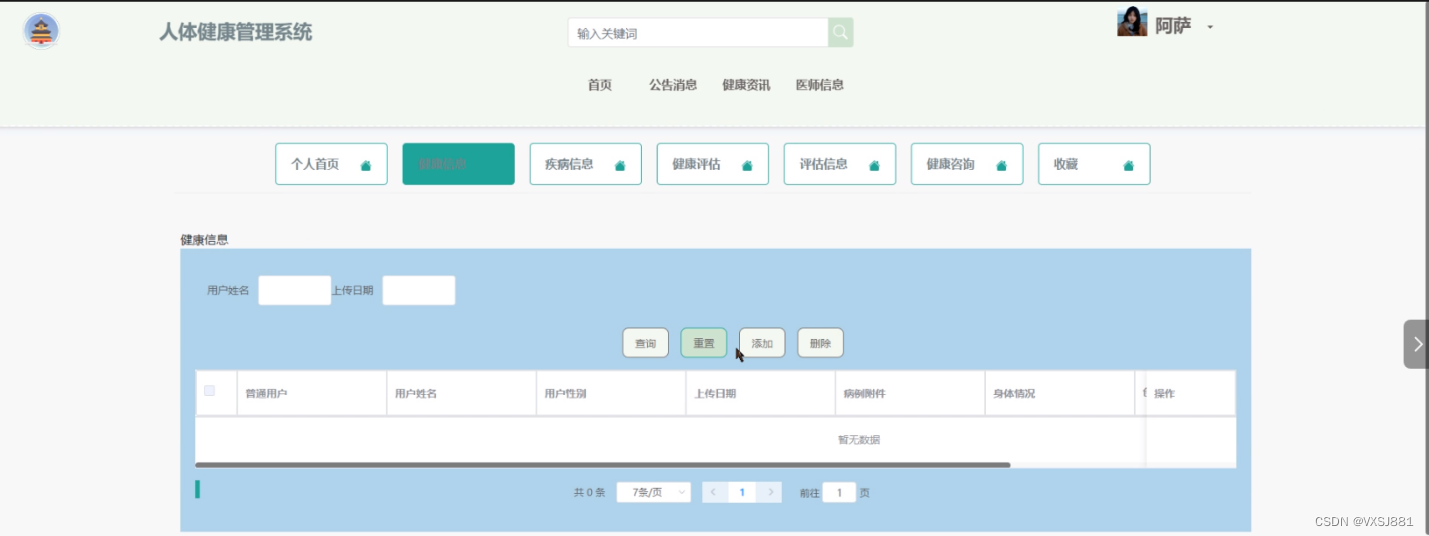 用户可以查看和管理个人中心中的个人首页、健康信息、疾病信息、健康评估、评估信息、健康咨询和收藏信息。可以对健康信息、疾病信息进行查询、添加和删除操作;可以对健康评估、评估信息、健康咨询信息进行查询和重置操作;可以查看或删除收藏列表信息。其界面如图4-7所示。