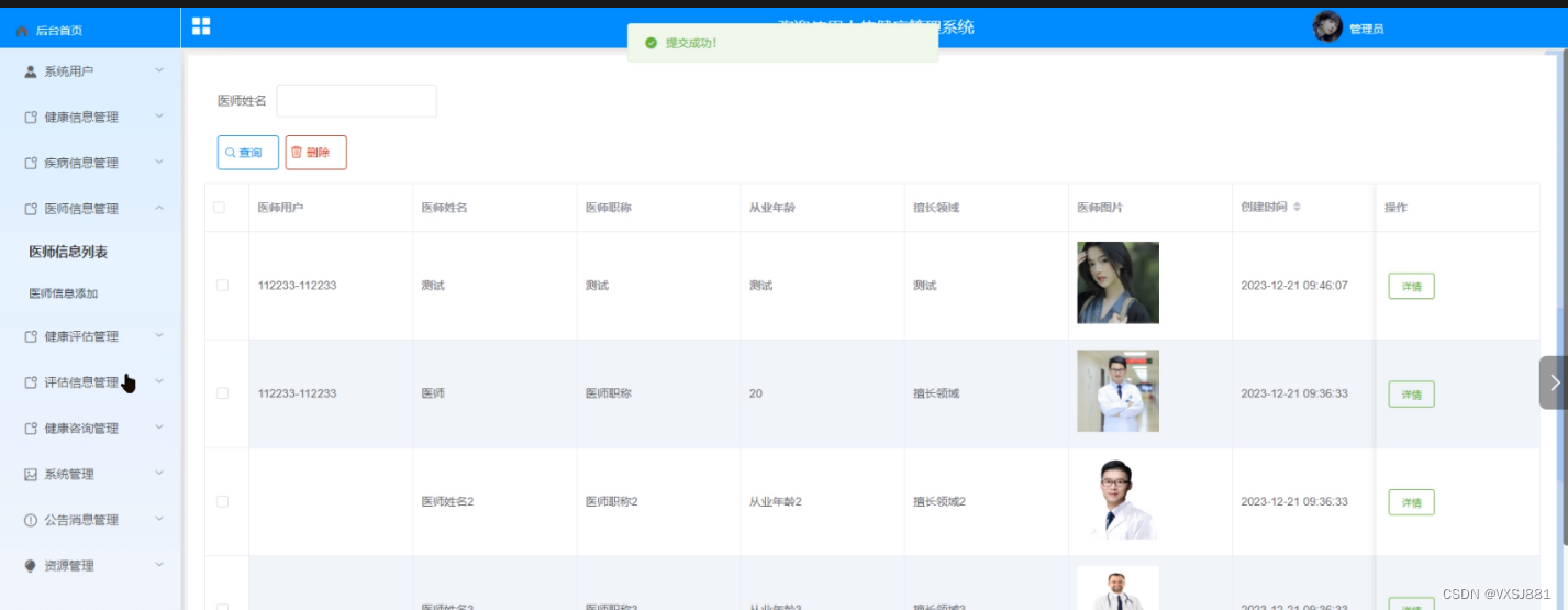 - 医师信息管理:管理员可以查看医师信息列表中某一医生信息详情,可以对医生列表信息进行查询、重置和删除操作;点击“医师信息添加”进入页面填写医师姓名、职称等信息后点击“提交”即可完成医师信息的添加。