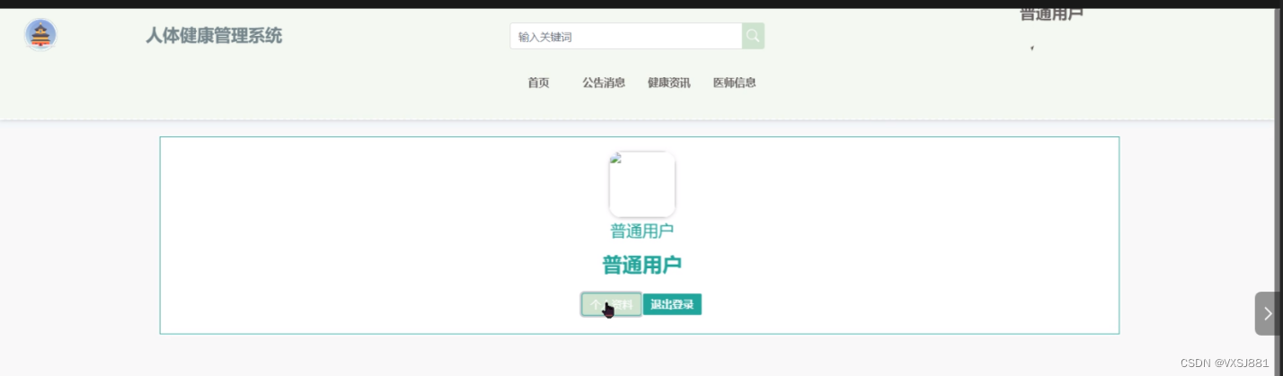 - 我的:用户点击右上角的用户头像的下拉按钮“我的账户”进入页面点击“个人资料”进入页面后可以修改个人头像、昵称和密码。用户可以查看和管理个人中心中的个人首页、健康信息、疾病信息、健康评估、评估信息、健康咨询和收藏信息。可以对健康信息、疾病信息进行查询、添加和删除操作;可以对健康评估、评估信息、健康咨询信息进行查询和重置操作;可以查看或删除收藏列表信息。