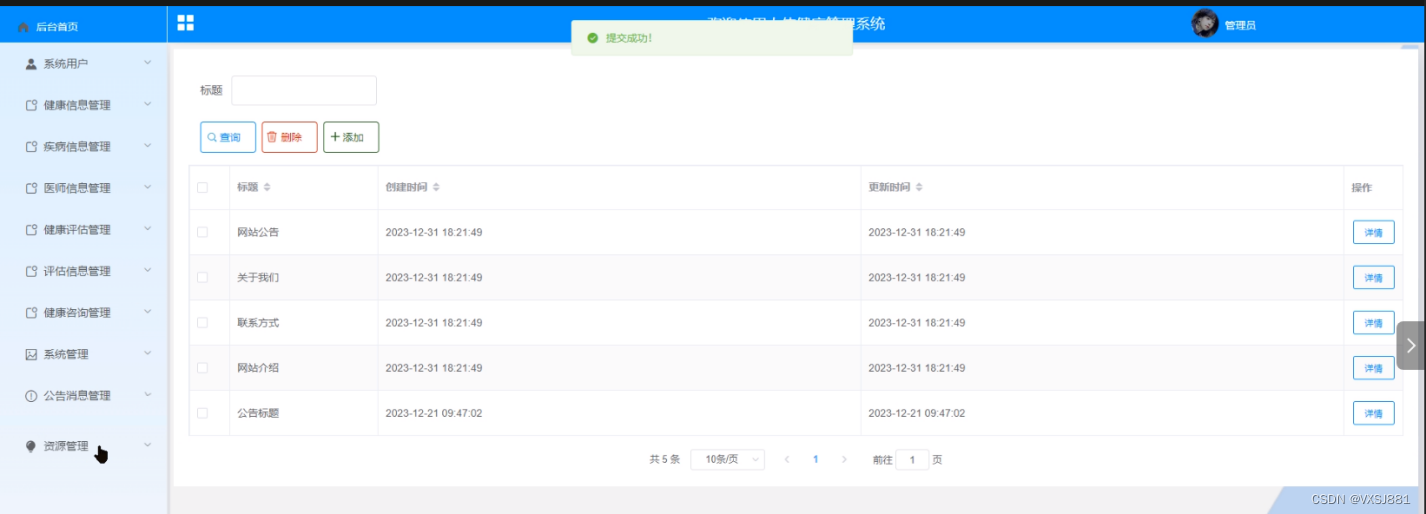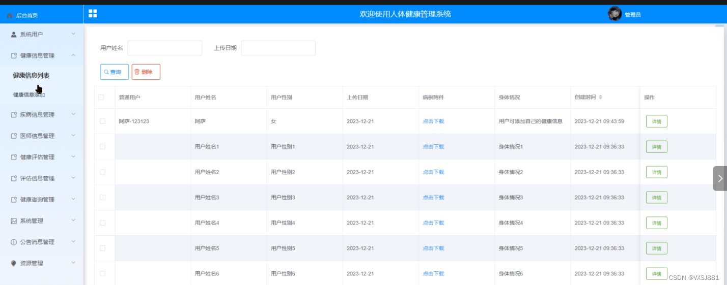- 健康信息管理:管理员可以查看健康信息列表信息,可以下载查看某一用户的病历附件,点击“后面的详情”可以查看该用户的健康信息详情,可以对健康信息列表进行查询和删除操作,可以添加健康信息。