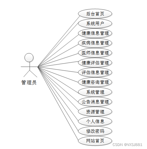 通过2.3功能的分析,得出了本Spring boot人体健康管理系统的用例图: