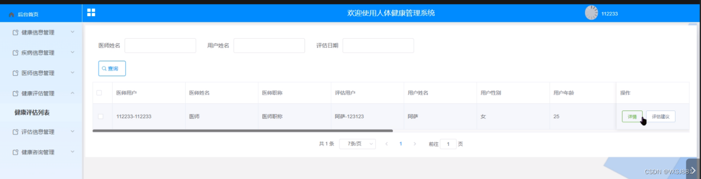 - 评估信息管理:管理员可以查看评估信息列表信息,点击列表中某个用户后面的“详情”可以查看该用户的详细的评估信息。
