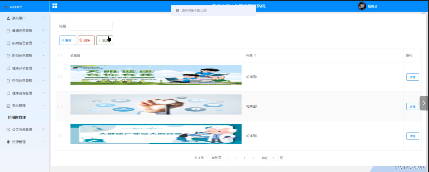 - 系统管理:管理员可以查看轮播图列表中某一轮播图详情,可以对系统轮播图信息进行查询、添加和删除操作。