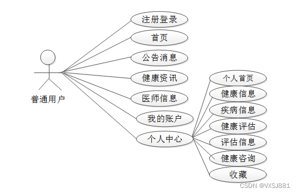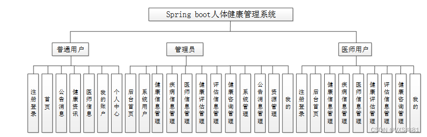 按照Spring boot人体健康管理系统的角色,主要包括普通用户、管理员和医师用户这三大功能模块,各模块功能内容如下: