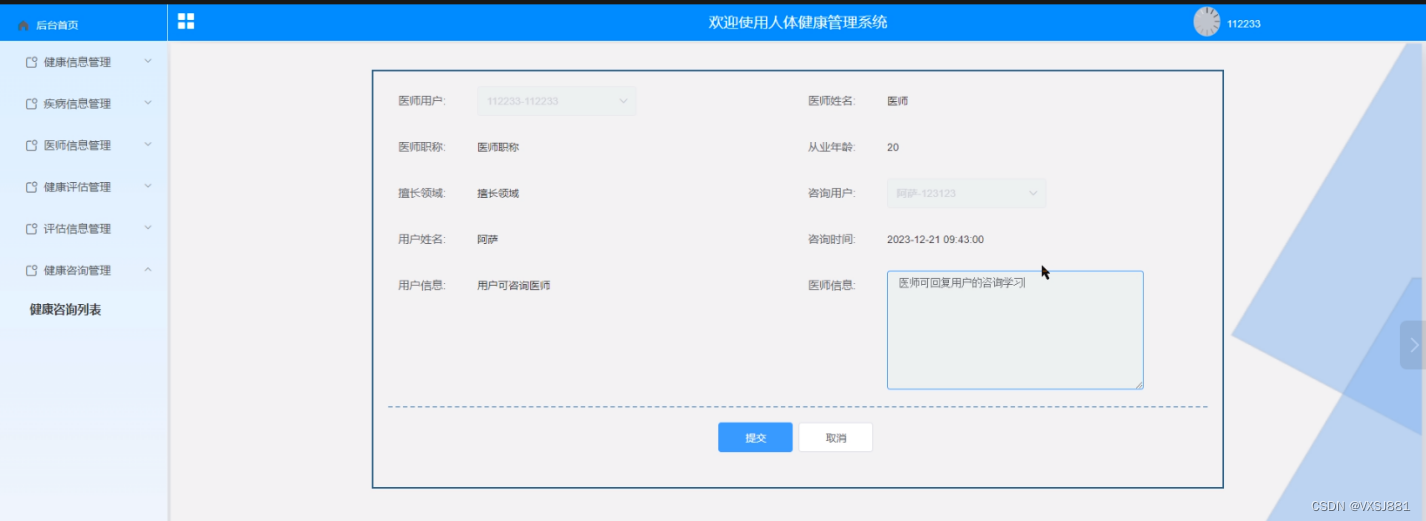 - 健康咨询管理:用户可以查看健康咨询列表信息,点击列表中某一用户信息后面的“详情”进入页面可以查看该用户的咨询详细信息并进行回复。