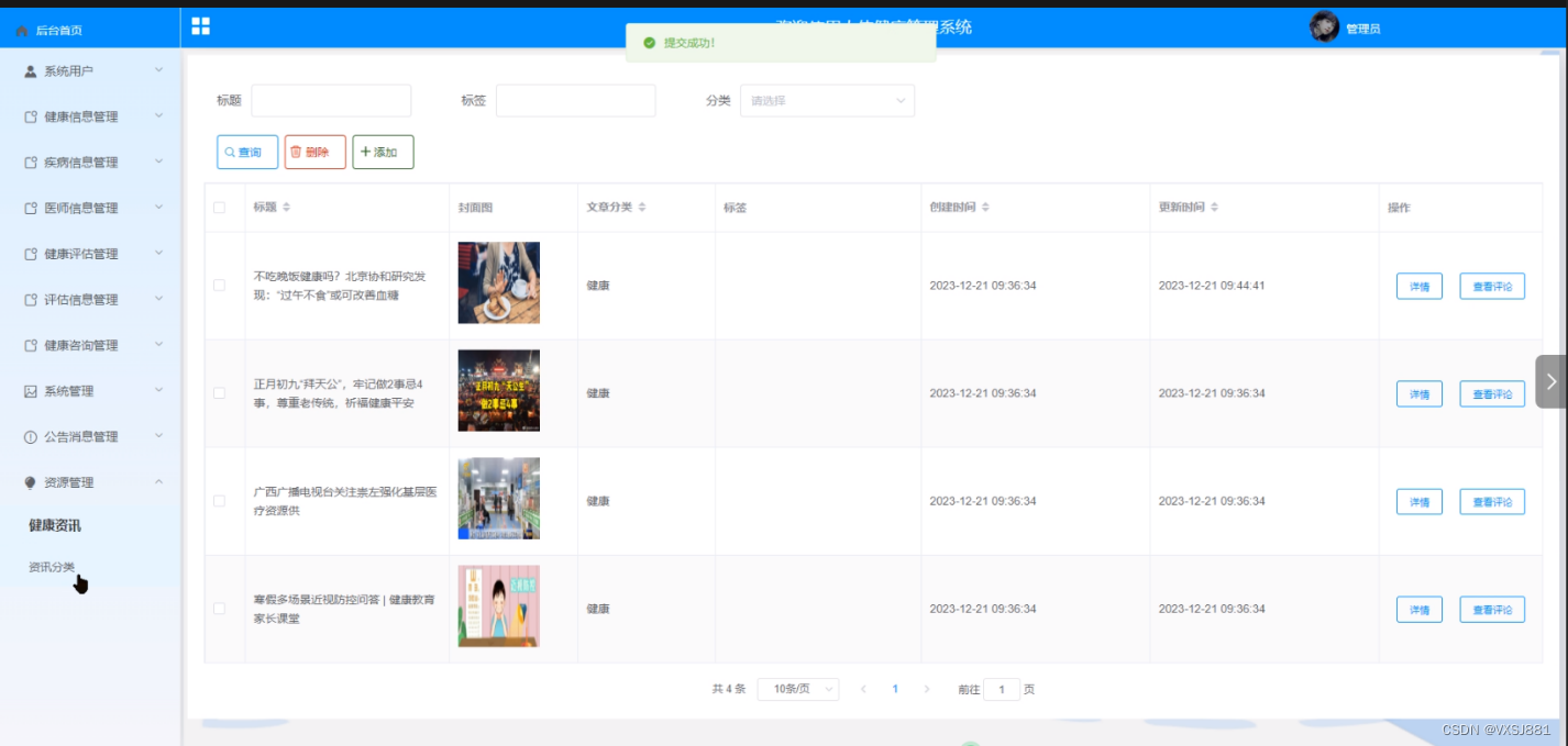 - 资源管理:管理员可以查看健康资讯列表中某一资讯详情和评论信息,可以对健康资讯列表信息进行查询、添加和删除操作;管理员可以查看资讯分类列表中某一资讯详情,可以对资讯分类信息进行查询、添加和删除操作。