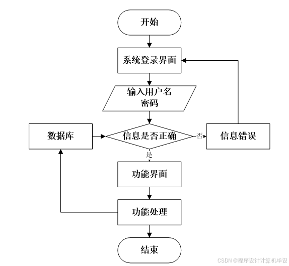 用户打开并进入系统后,会先显示登录界面,输入正确的用户名和密码,系统自动检测信息,若信息无误,则用户会进入系统功能界面,进行操作,否则会提示错误无法登录,操作流程如图2-3所示。