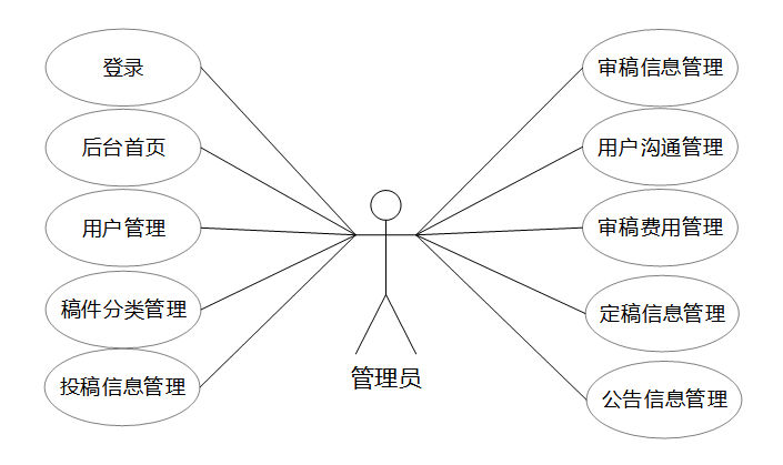管理员负责平台的整体管理,包括用户账号审核、投稿信息和审稿任务分配、以及稿件分类维护。管理员还监督审稿进度,确保任务按时完成,同时管理用户间的沟通、审稿费用和定稿信息。平台公告发布和系统更新由管理员统一管理,确保平台运行顺畅。管理员角色用例如下图所示。