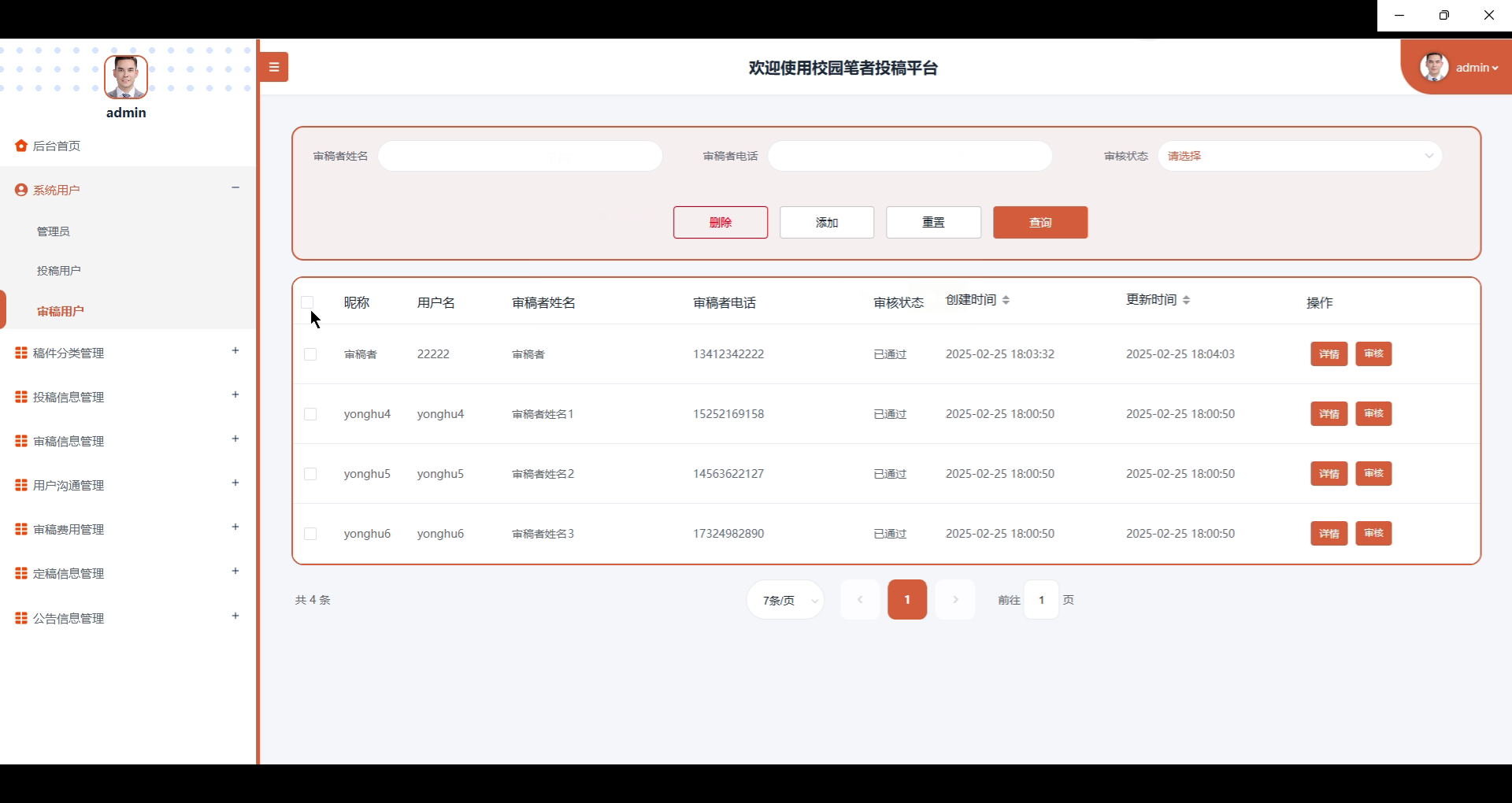 管理员可以查看和管理所有投稿用户的信息,包括账号状态、活动记录、用户权限等。可以对不符合规定的用户进行禁用或删除操作,保障平台秩序。界面图如下所示。
