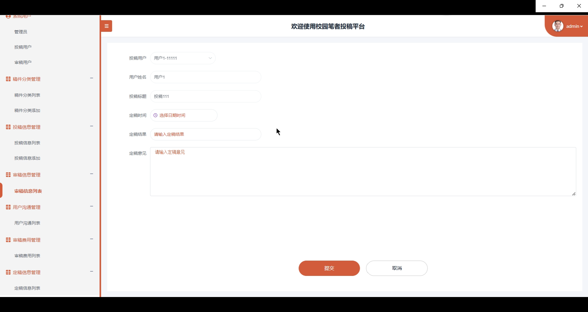 | 1 | 投稿审核 | 审稿人查看投稿信息并填写审核意见 | 审核成功,意见已提交 |