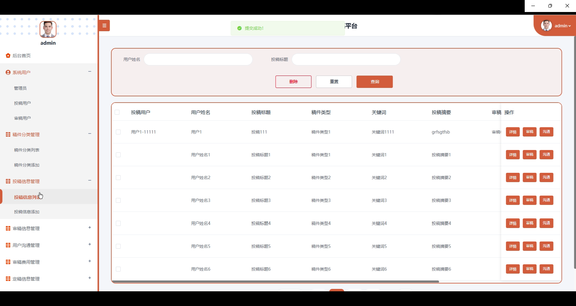 投稿信息管理模块让管理员查看和管理所有投稿信息。管理员可以查看每篇稿件的基本信息、投稿者资料、稿件状态及审稿进展,并对投稿进行审核或处理。管理员还可以修改稿件的状态、分配审稿人并跟踪稿件的审核和沟通历史,确保投稿流程的顺利进行。界面如下所示。