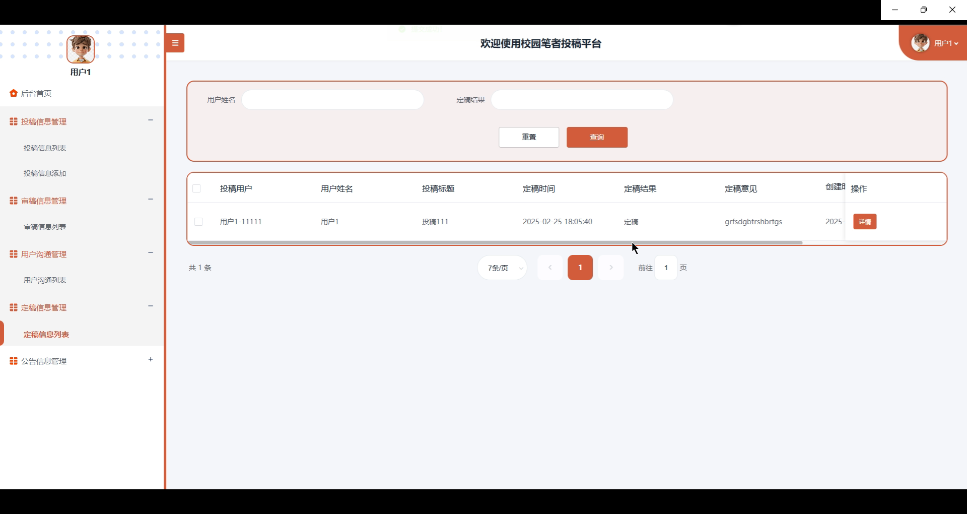 定稿信息管理模块允许管理员维护和更新定稿信息,包括记录定稿时间、结果和定稿意见。管理员可以根据审稿和修改意见对稿件进行最终确认,确保定稿信息准确无误,并能够及时向投稿者反馈定稿结果。界面如下所示。