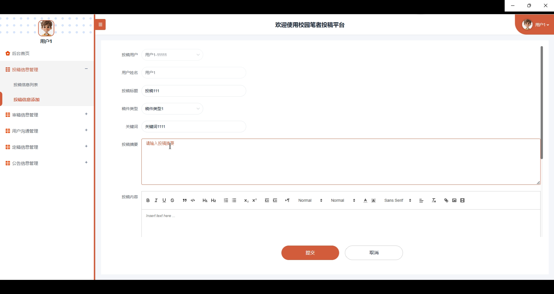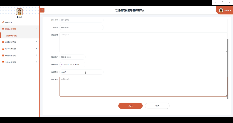投稿信息管理模块允许投稿用户提交学术稿件。用户需填写基本信息,如姓名、投稿标题、稿件类型、关键词、投稿摘要及详细投稿内容。此外,系统支持设置审稿次数限制和沟通次数限制,确保稿件在审稿过程中不会过度修改。用户提交后等待审核。界面图如下所示。