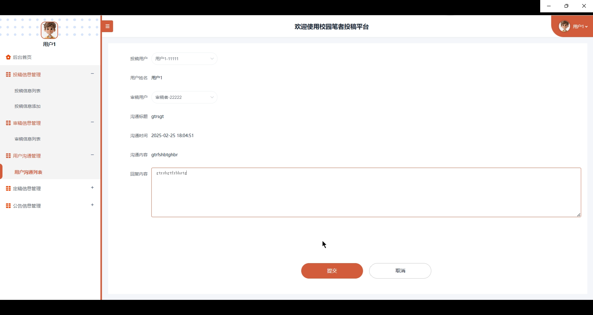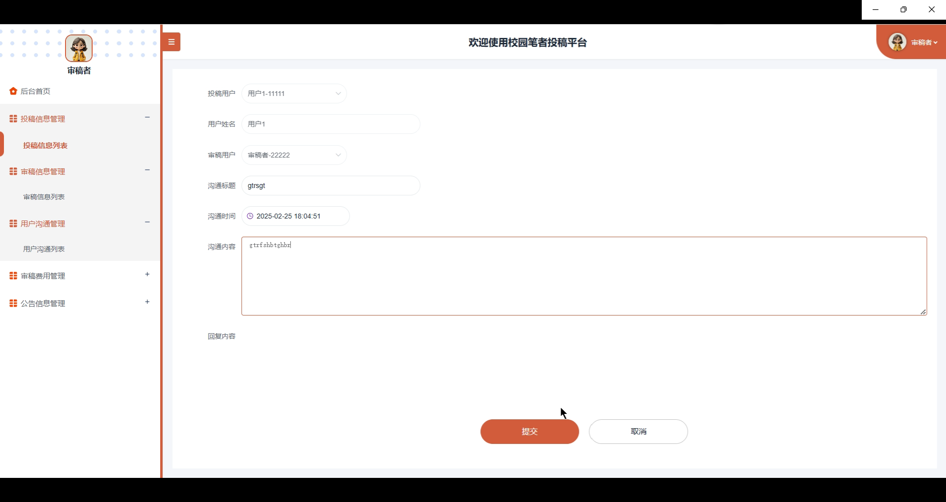 | 2 | 用户沟通 | 审稿者回复投稿者的反馈信息 | 回复信息成功发送 |