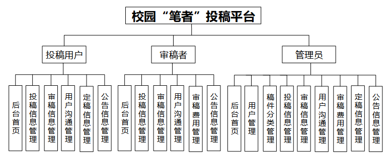 功能模块设计是系统开发过程中的重要阶段,将系统划分为不同的模块,每个模块负责完成特定的功能或任务。校园“笔者”投稿平台由多个功能模块组成,每个模块下又包含具体的功能操作。功能模块图如下图所示。