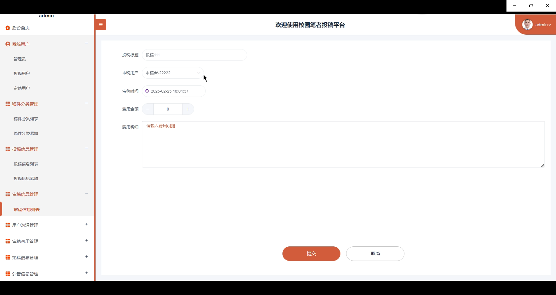系统的实施使投稿用户能够更加便捷地管理稿件,实时跟进审稿进度和反馈;审稿者可以轻松查看待审稿件并提供修改意见,同时管理审稿费用;管理员则能够全面掌控平台的运营,管理用户、分配审稿任务、处理费用和定稿信息。这些功能的设计和实现大大提升了各角色之间的沟通效率和协作体验。