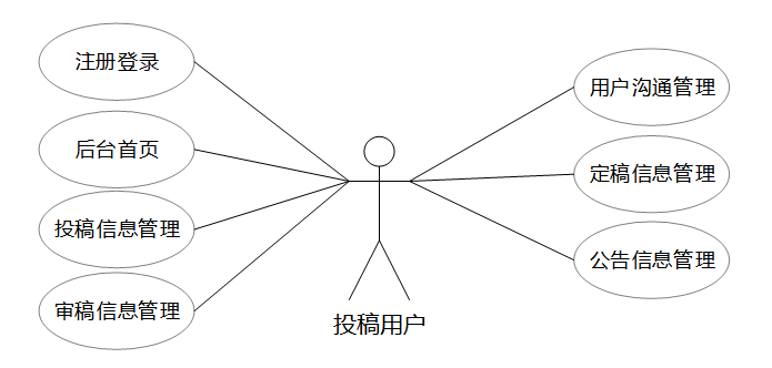 投稿用户可以通过注册并登录平台,管理个人稿件的提交、编辑、删除与进度查看。用户可以实时查看审稿信息与反馈,与审稿人和管理员进行沟通交流,了解稿件修改建议,并跟踪稿件定稿情况。平台还提供公告信息,帮助用户及时了解最新通知和系统动态,提升投稿体验。投稿用户角色用例如下图所示。