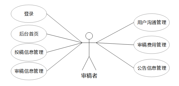 审稿者通过平台查看待审稿件,评审稿件内容并提供修改意见,同时管理审稿进度和审稿费用。审稿者可以与投稿用户直接沟通,提供专业的反馈和建议。平台还展示审稿的费用管理信息,并及时更新公告和通知,帮助审稿者高效完成审稿任务。审稿者角色用例如下图所示。