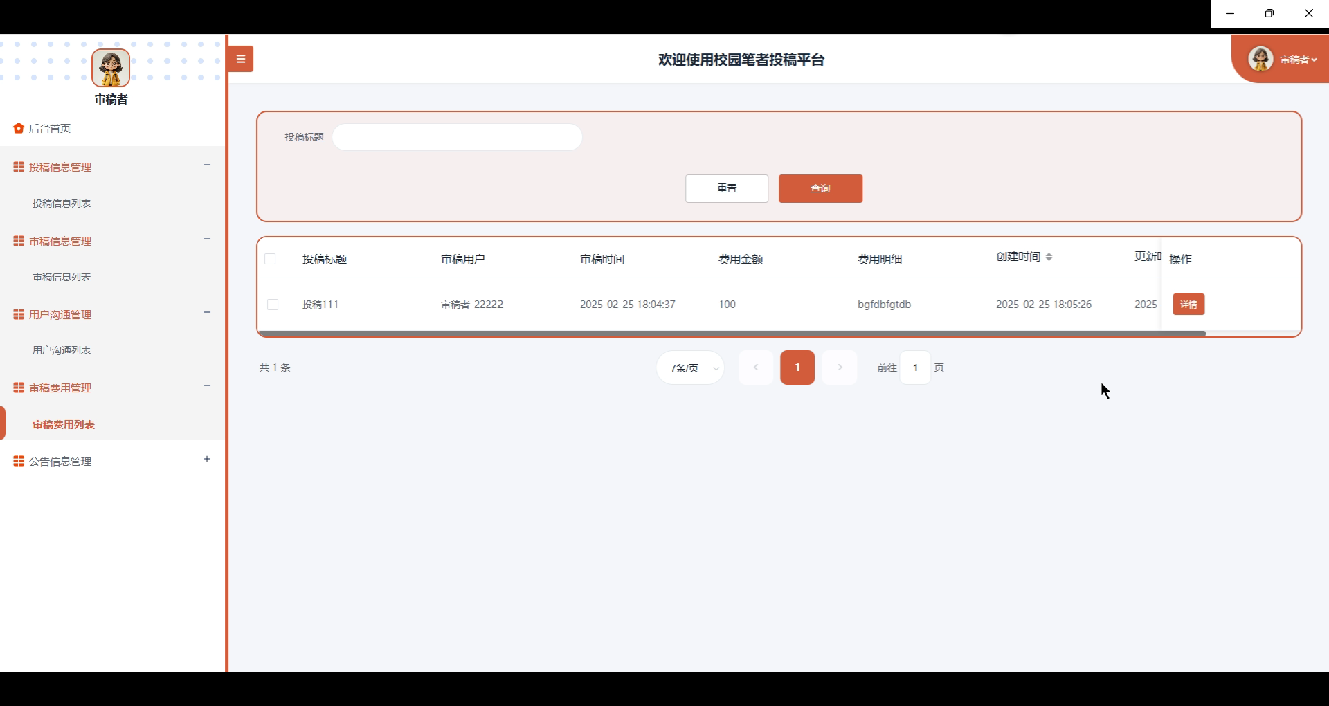审稿费用管理模块帮助管理员跟踪审稿费用的支出。管理员可以查看每篇稿件的审稿费用,记录审稿用户、审稿时间、费用金额和详细费用明细。界面如下所示。