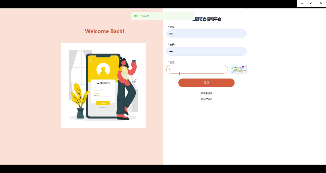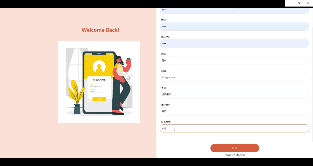 用户注册功能允许新用户通过邮箱或手机号创建账户,确保注册过程简便且安全。系统会验证用户输入的信息的有效性,如邮箱格式或手机号的唯一性。注册后,用户可通过设置密码和个人信息完成账户的创建。界面图如下所示。
