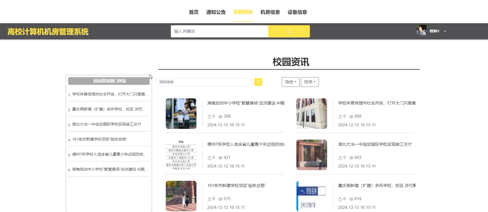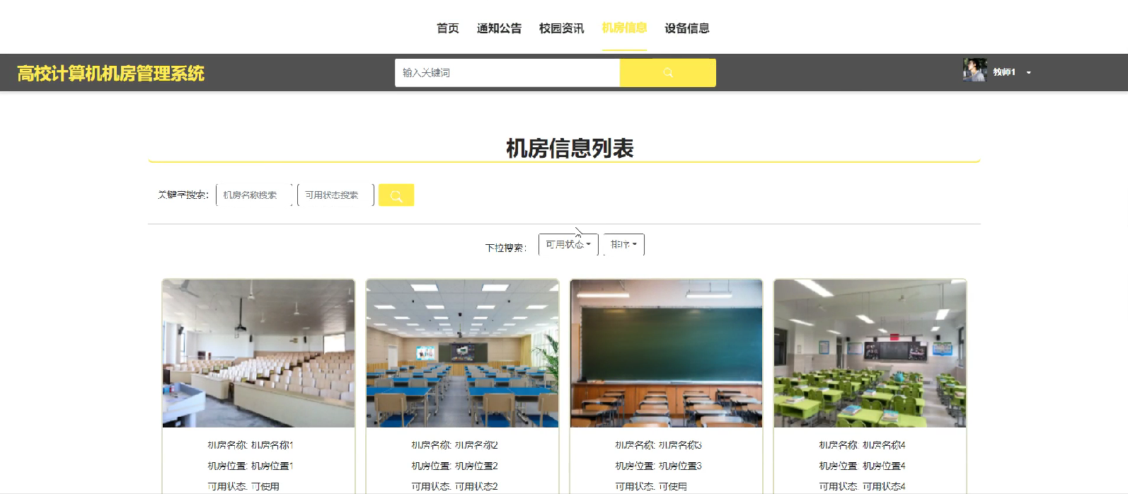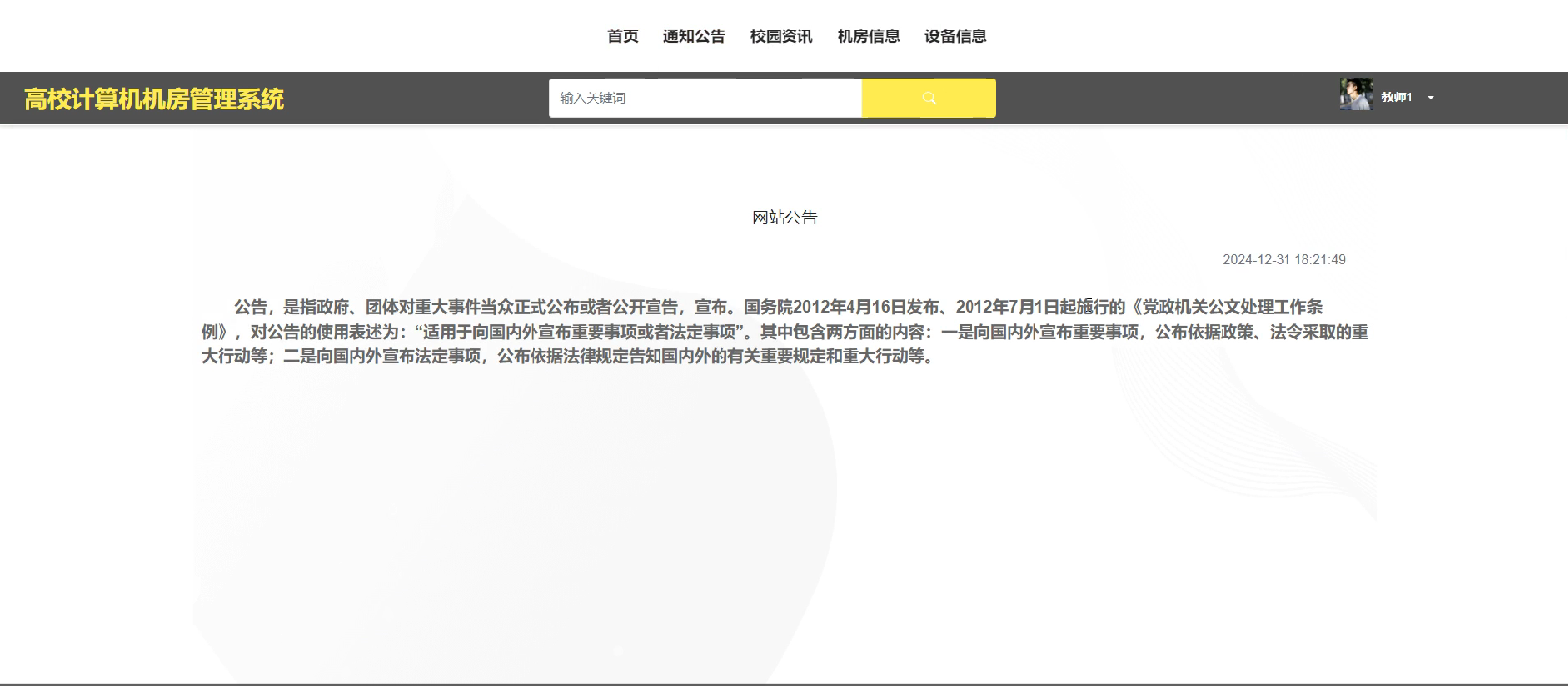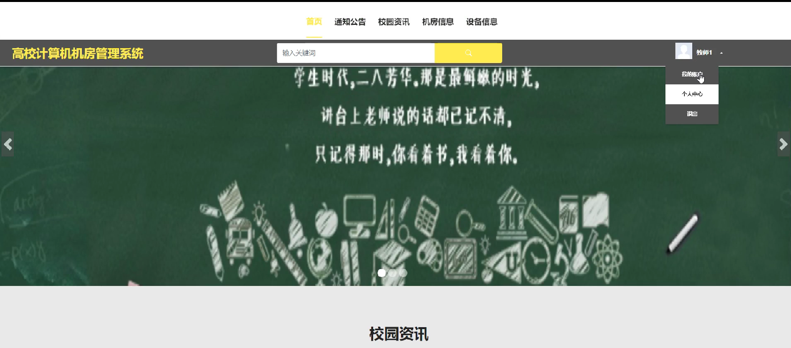 首页:首页是教师用户进入系统后看到的主界面,提供快速导航到系统内其他功能模块的入口,如通知公告、校园资讯、机房信息等。同时,首页可能会展示一些重要信息或快捷操作按钮。
