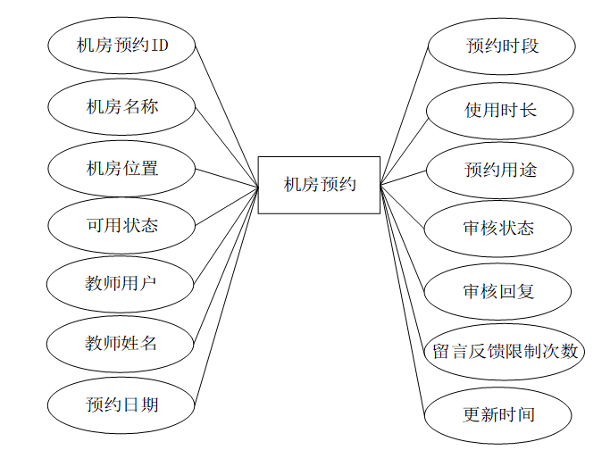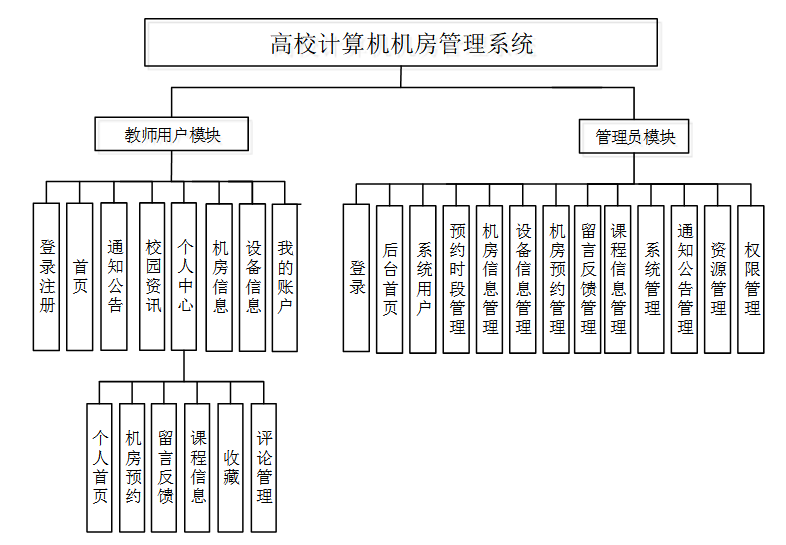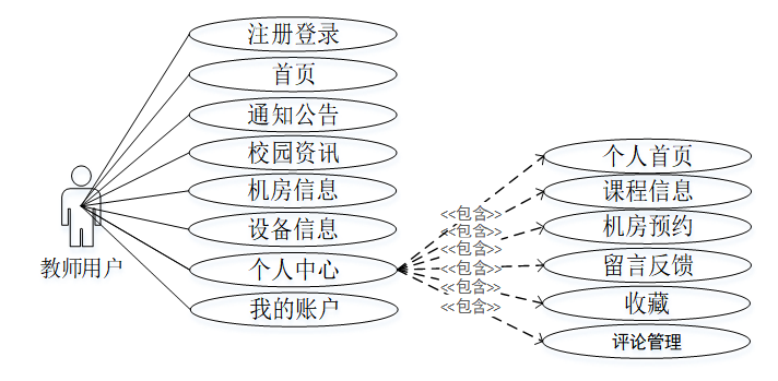 教师用户具备登录注册、首页、通知公告、校园资讯、机房信息、设备信息、我的账户、个人中心(个人首页、机房预约、留言反馈、课程信息、收藏、评论管理)等需求用例,详细用例图如图3-1所示。