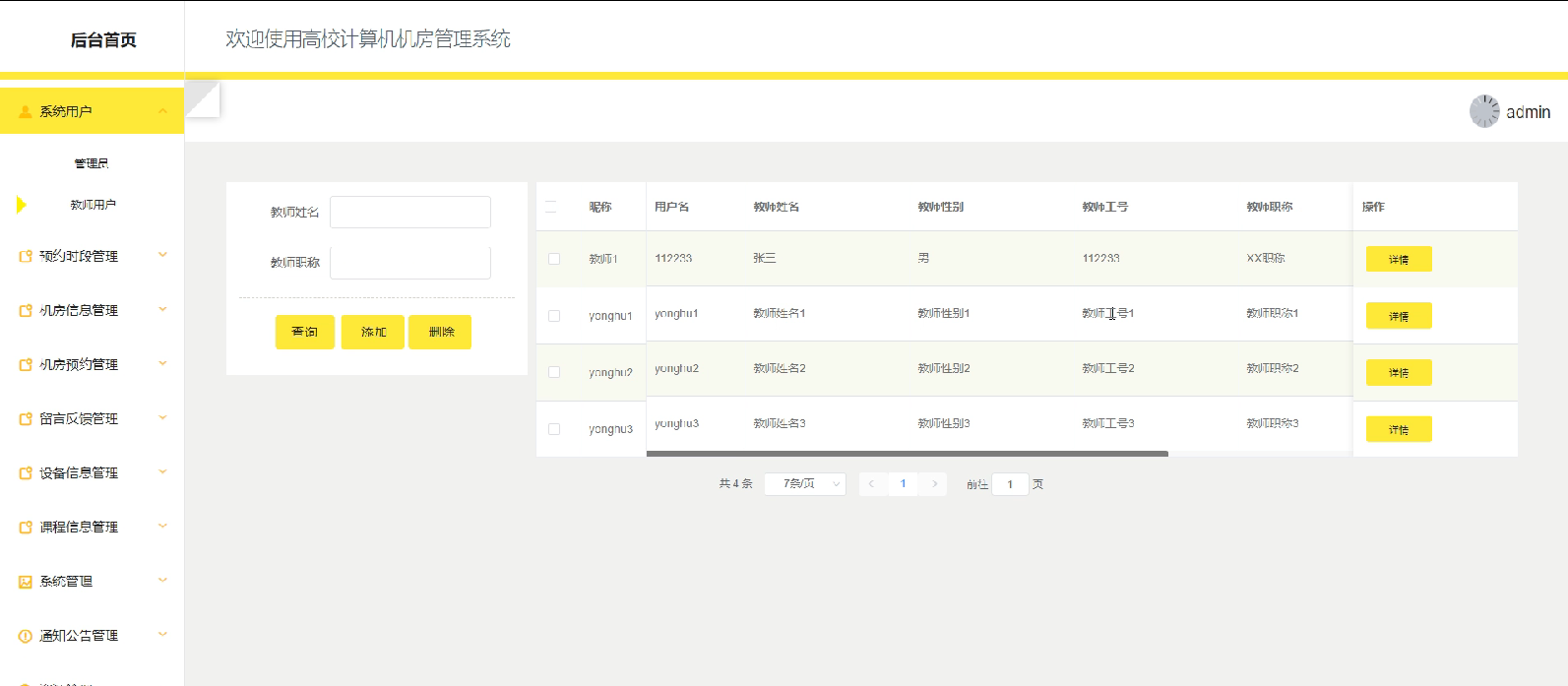 高校计算机机房管理系统系统中的管理人员是可以对注册教师用户和管理员进行管理的,包括对用户信息进行增删改查等操作,也可以对管理员进行管控。界面如下图5-12所示。