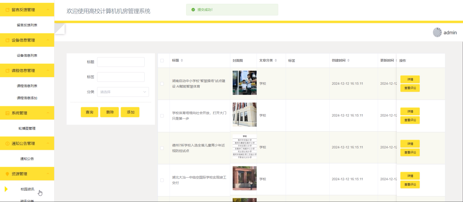 资源管理:管理员可以管理校园资讯,包括添加、查询、删除资讯内容以及查看用户评论。此外,管理员还可以对资讯分类进行添加、查询和删除操作。这有助于维护一个丰富且有序的信息资源库。