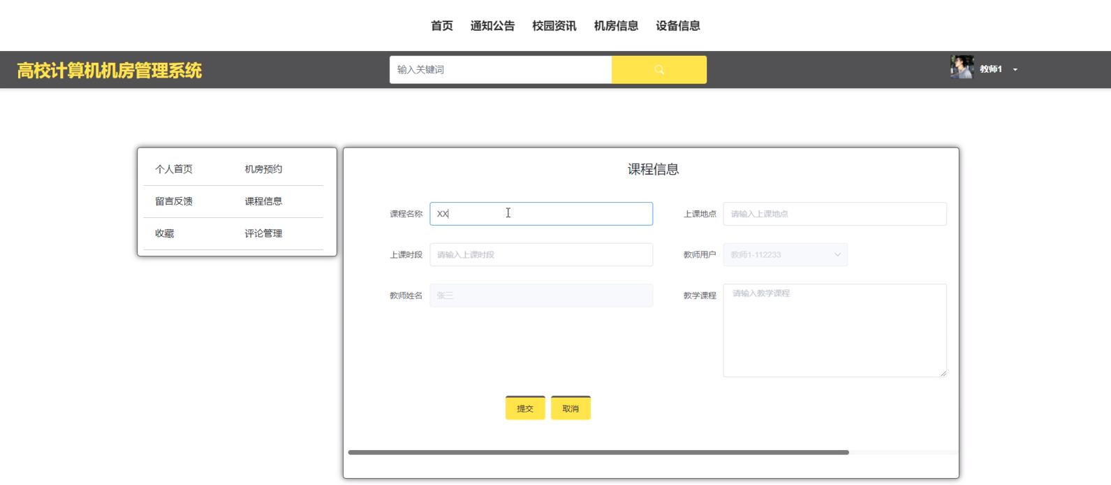 个人中心:包括个人首页、机房预约、留言反馈、课程信息、收藏、评论管理等功能。机房预约:教师可以查看自己的预约记录和审核状态。留言反馈:教师可以发布留言和查看自己的留言信息。课程信息:教师可添加自己的课程信息。收藏:教师可以收藏感兴趣的资讯、机房信息或设备信息,方便日后快速访问。机房预约页面如图5-10。添加课程信息页面如图5-11。